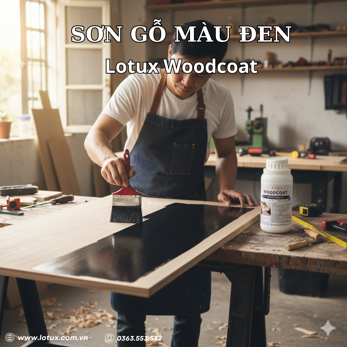 Lotux Woodcoat màu đen không chỉ mang lại vẻ ngoài hiện đại cho sản phẩm gỗ mà còn giúp quá trình thi công trở nên đơn giản, ổn định và tiết kiệm thời gian. Đây là lựa chọn phù hợp cho xưởng mộc, thợ thi công và cả người dùng cá nhân.